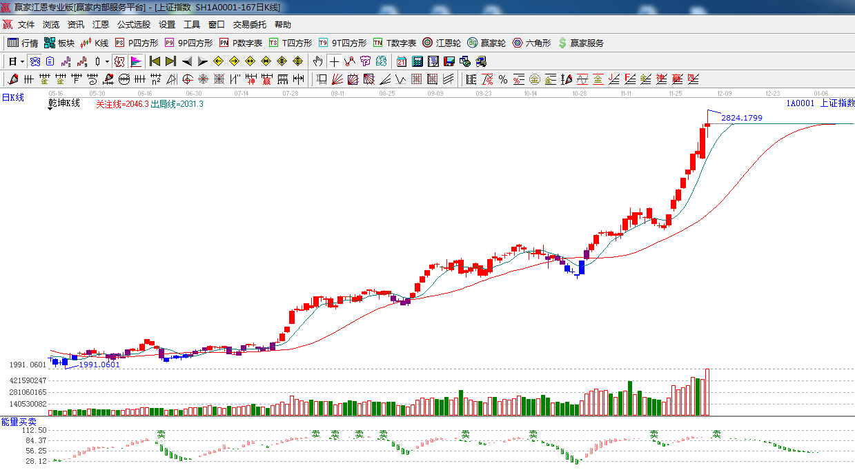 周三兩市紛紛高開高走,券商繼續維持強勢,大盤一度沖擊江恩240度線附近,成交量明顯放大,午后權重集體跳水,題材股全面而上,終盤以放量十字星報收,盤面上,隨著券商板塊走勢的分化,有色板塊全面爆發,多只個股漲停,另外,體育,軍工改制等有所表現,創業板午后一改前期弱勢全線大漲,市場二八風格進一步加劇,權重和題材形成鮮明反差,今日市場之中的成交量可謂再度創出歷史新高,十字星報收,預計短期高位震蕩。下方支撐關注180度2743點。