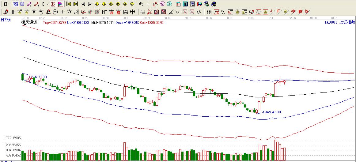 綜上所述:大盤極反通道上軌4次上攻都沒收復,12.21日是重要時間窗口。極反通道上軌2174位置得失極其重要。紅色上軌位置2240附近。