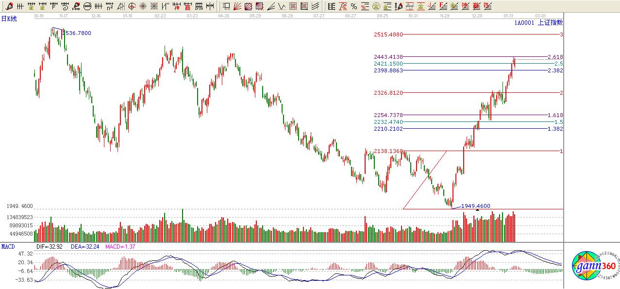 綜上所述:大盤(pán)極反通道藍(lán)色上軌位置不破,按照極反通道應(yīng)用法則看高一線至2457點(diǎn),短期黃金分割2.382/2.618位置震蕩難免。
