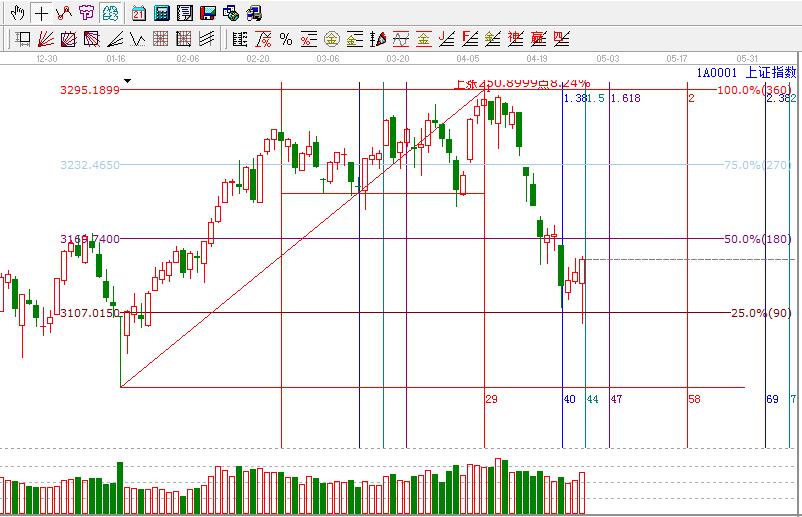 依據贏家江恩技術工具分析得出:周四,股指在藍色線超跌區域探底回升,成交量有所釋放,短期還有反彈空間,接下來關注180度線3170點附近,缺口3189--3196點。有技術基礎的投資者,可以把握短線反彈機會,整體由于趨勢生命線之下,弱勢區域。倉位控制在3-5成。手中個股可適當逢低補倉差價。時間上,25日之后下一窗口5月2日左右。