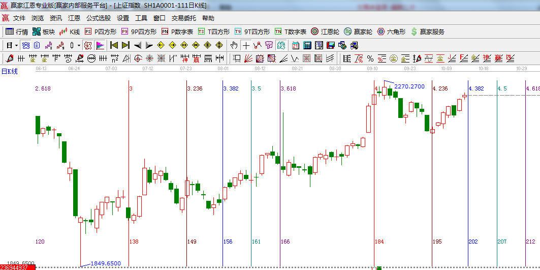 ☆依據(jù)贏家江恩系統(tǒng)波段百分比延伸提示:240-270度位置是2232-2255;