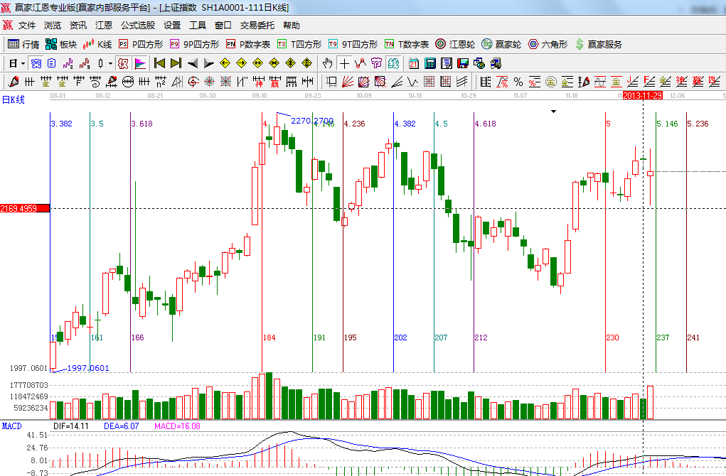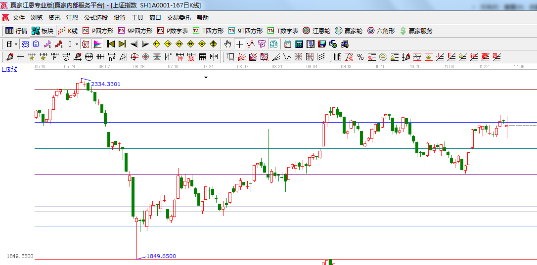 ☆依據(jù)贏家江恩系統(tǒng)波段百分比延伸提示:2444與1849點(diǎn)做黃金分割價格圖,0.382位置是2217點(diǎn),下方支撐為0.5位置2150,上方拋壓在前期頭部2265附近;