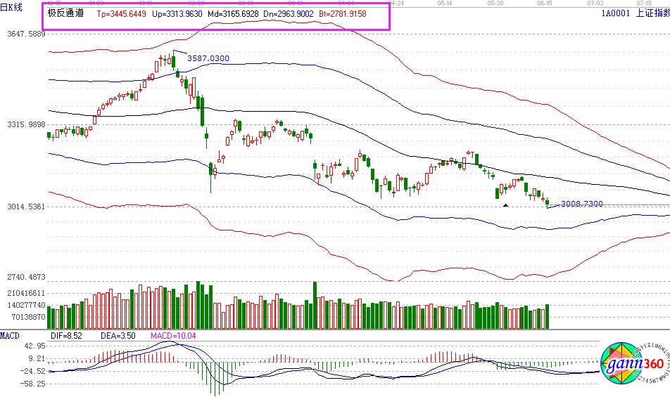 滬指跌0.73%,報收3021點;深成指跌1.40%,報收9943點;創業板跌1.89%,報收1641點。盤面上看,煤炭、銀行、粵港澳自貿區等少數板塊上漲;石油、啤酒、海南、知識產權保護、生態農業、服裝紡織等板塊下跌。全天,滬股通凈流入22億元,深股通凈流入6億元。相應的極反通道指標的支撐壓力提示,如下圖所示: