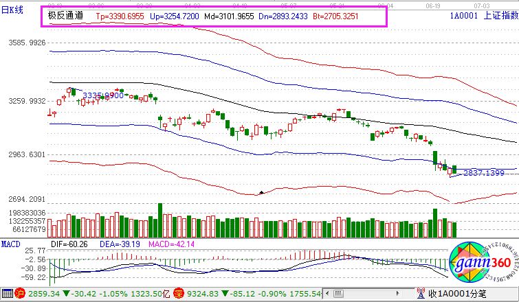 滬指跌1.05%,報收2859點;深成指跌0.90%,報收9324點;創業板跌0.72%,報收1538點。從盤面上看,石油采掘、白酒、債轉股、鈦白粉、農業、次新股、上海國資改革等板塊漲幅居前;機場航運、鋼鐵、煤炭、銀行、租售同權、豬肉、造紙等板塊跌幅居前。滬股通凈流出23億,深股通凈流出12億。相應的極反通道指標的支撐壓力提示,如下圖所示: