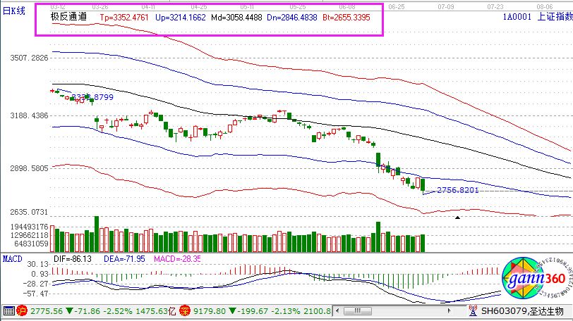 滬指跌2.52%,報(bào)收2775點(diǎn);深成指跌2.13%,報(bào)收9179點(diǎn);創(chuàng)業(yè)板跌1.14%,報(bào)收1588點(diǎn)。從盤(pán)面上看,海南、食品安全、分散染料等少數(shù)板塊飄紅;粵港澳大灣區(qū)、煤炭、鋼鐵、租售同權(quán)、證券、銀行、房地產(chǎn)等板塊跌幅居前。相應(yīng)的極反通道指標(biāo)的支撐壓力提示,如下圖所示: