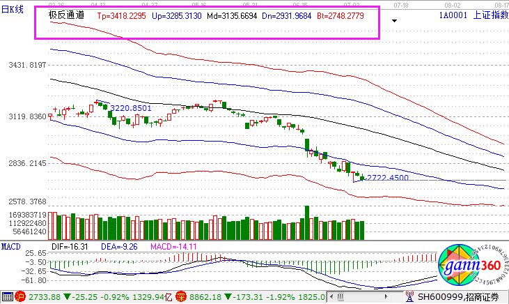 滬指跌0.92%,報2733點;深成指跌1.92%,報8862點;創業板指跌2.10%,報1532點。盤面上看,粵港澳大灣區、鋼鐵、物流、分散染料、稀土永磁、煤炭等板塊跌幅居前。滬股通凈流入18億,深股通凈流入5億。相應的極反通道指標的支撐壓力提示,如下圖所示: