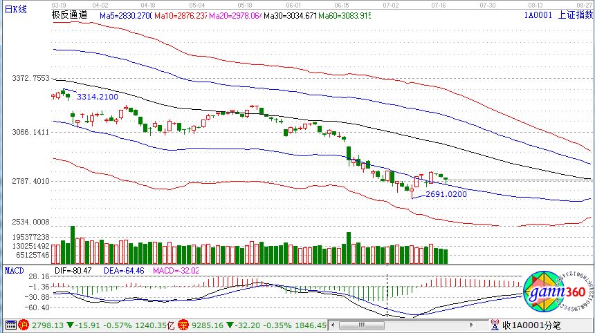 滬指跌0.57%,報收2798點;深成指跌0.35%,報收9285點;創業板漲0.29%,報收1621點。從板塊漲幅上看,石墨烯、農機、養殖、化工新材料、5G、互聯網彩票等漲幅居前;鋼鐵、超級品牌、白酒、煤炭、海南、醫藥電商等板塊跌幅居前。滬股通凈流出9000萬,深股通凈流出4億。相應的極反通道指標的支撐壓力提示,如下圖所示: