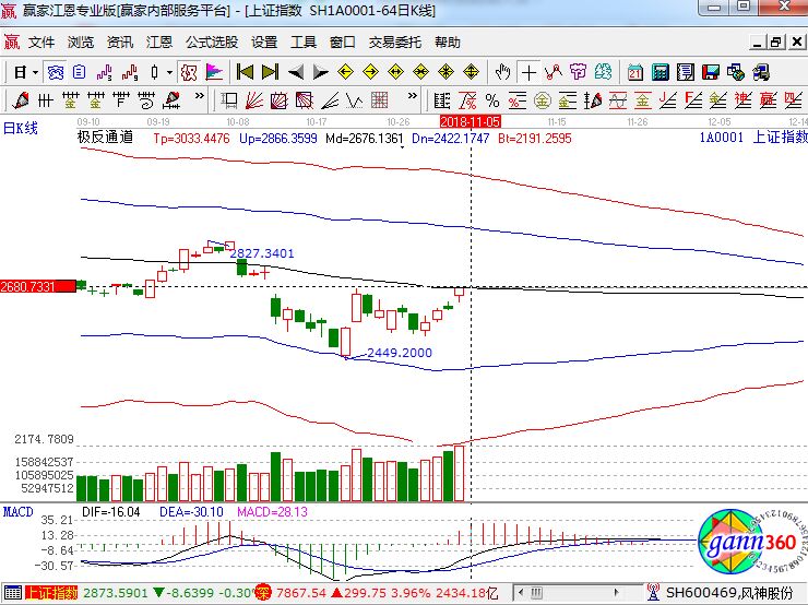 滬指漲2.70%,報收2676點;深成指漲3.96%,報收7867點;創業板漲4.82%,報收1348點。從盤面上看,機場航運、白酒、化工新材料、知識產權保護、健康中國、集成電路等板塊領漲。滬股通凈流入113億,深股通凈流入65億。相應的極反通道指標的支撐壓力提示,如下圖所示: