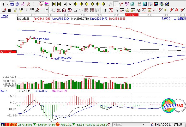 滬指跌0.82%,報收2576點;深成指跌0.82%,報收7530點;創業板跌0.45%,報收1293點。盤面上看,黃金、ST板塊、軍工、電力等板塊漲幅居前;裝配式建筑、高送轉、雄安、深圳國資改革、水泥等板塊跌幅居前。滬股通凈流出15.3億,深股通凈流出12.5億。相應的極反通道指標的支撐壓力提示,如下圖所示: