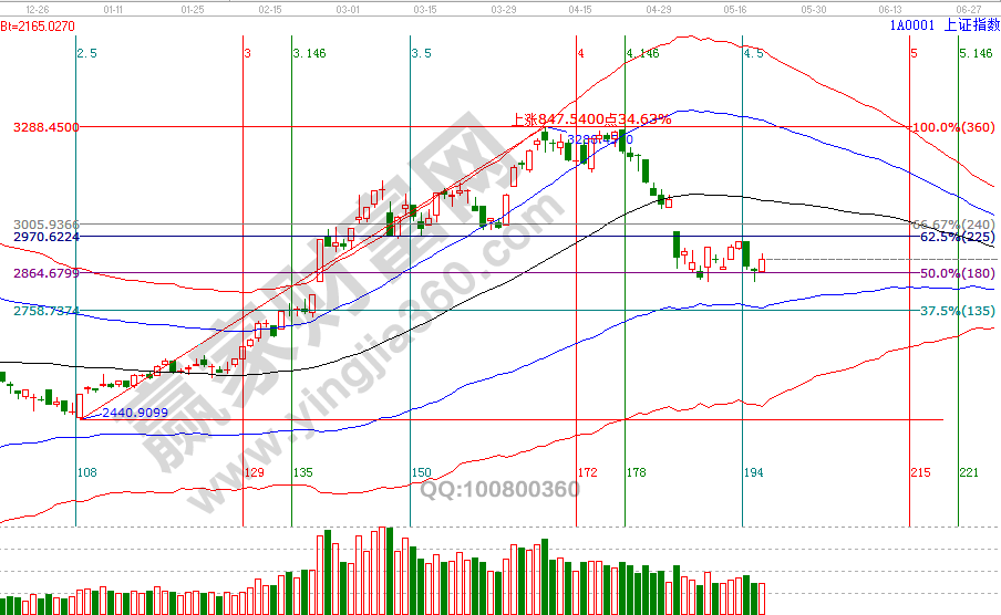 5月10號、20號,大盤日K線分別回探波段百分比延伸線1倍循環(huán)二分位2834點后止跌企穩(wěn),第一次反彈止步于短周期60分鐘生命線位置,本次關(guān)注此線能否突破站穩(wěn)(學(xué)員通過工具查看關(guān)鍵位),站上此線則指數(shù)日k線回補(bǔ)下方缺口的概率將降低(但不排除),23號短周期時間后會再次進(jìn)行評估。投資者應(yīng)好好把握當(dāng)前機(jī)會,待整固結(jié)束后市場必會有一波反彈到生命線的機(jī)會。本周短周期重要時間窗口是23號,日線時間窗口是28(29)號。22號盤中壓力是180度2928點、225度2944點,盤中支撐是90度2894。操作策略,指數(shù)擊破黑色生命線進(jìn)入弱勢區(qū)域,高風(fēng)險者倉3-5成,低風(fēng)險者本周進(jìn)入備戰(zhàn)期擇機(jī)參與。