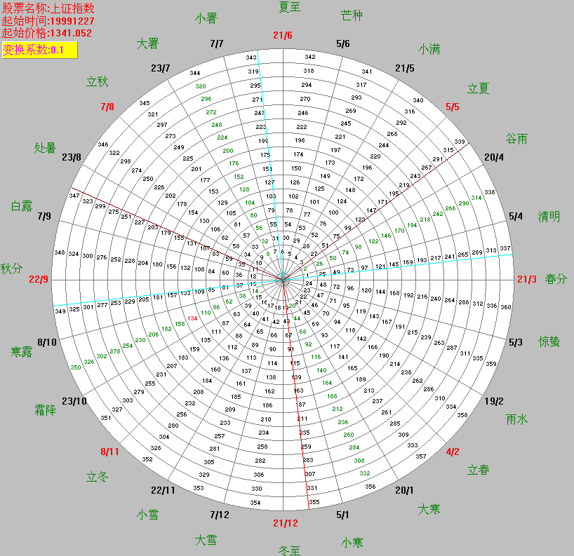 如果股價或指數較大或較小不能在360數的輪中輪顯示,則可以選擇適當的變換系數,將股價或指數進行變換使其對應輪上的一個數字,這個數字是用紅色表示的。