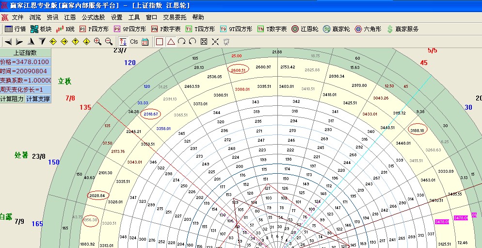 用鼠標點擊3478點,屏幕上方會有一個小三角說明我們選中該點位,然后鼠標點擊工具欄中江恩輪圖形打開如下圖,變換系統使用默認的1,周天變化步長默認1,最后點擊計算支撐,我們發現歷史上重要的點位如3186、2610、2319等點位都在輪子上面得到提現,3186是30度位置、2610是90度位置,2319為120度,依此來推算當下大盤支撐是150度的2028點,此點位與江恩箱,黃金分割、極反通道等分析工具得出點位基本一至,需要投資者重點關注此區域得失。