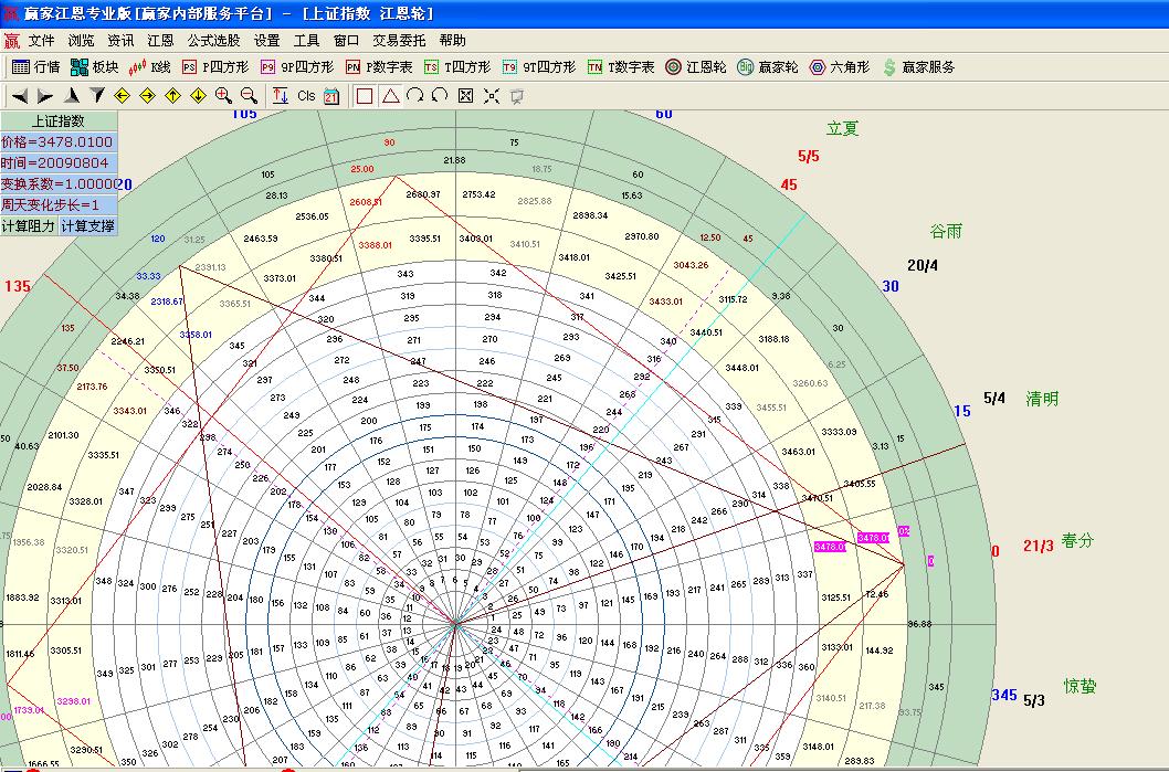 咨詢:13333833889輪中輪在江恩理論中可以說占據(jù)者舉足輕重的地位,其重要的點位往往會發(fā)生重要的轉(zhuǎn)折,而江恩價格百分比跟輪中輪有著較為密切的關(guān)系,他們之間有著什么樣的關(guān)系,輪中輪的點位是如何計算出來的?我們以大盤2009-08-04日3478.01點為高點來解說輪中輪跟江恩價格百分比的共同之處跟計算方法: