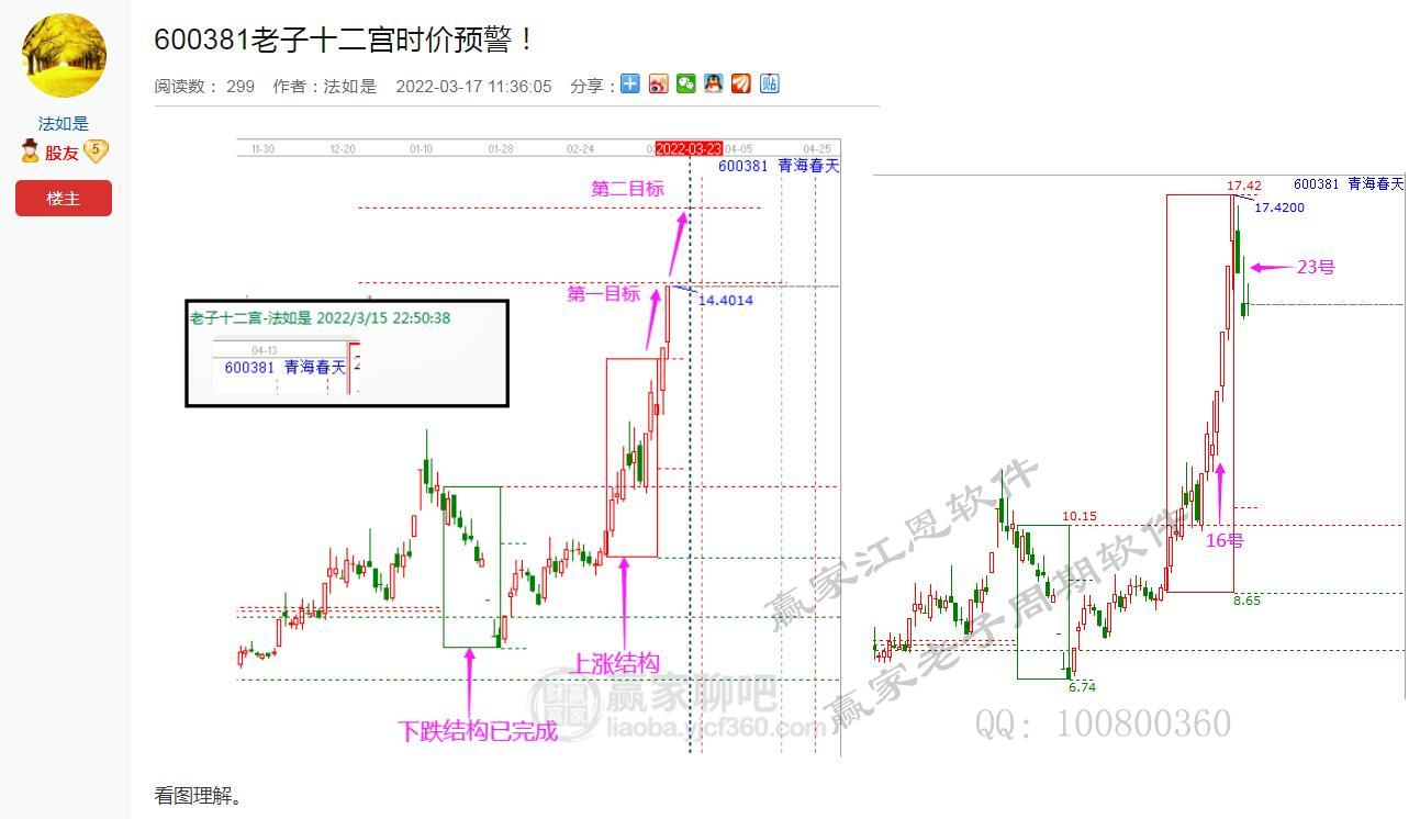 15號老子十二宮關注的青海春天,預測時間窗23號,22號方向異動,按照贏家預測體系+操作體系,22號直接就是止盈位出局。5天4板的利潤空間!想賺錢,先要補充自己的認知!