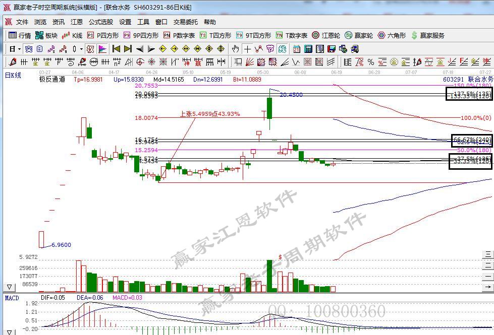 以603291聯(lián)合水務(wù)為例,符合工具規(guī)則,買之前的操作策略:江恩百分比三分位33.33%(1/3=120°)站穩(wěn),且突破關(guān)鍵50%(4/8=180°)抄進(jìn),目標(biāo)設(shè)定下個(gè)三分位,運(yùn)行一個(gè)完整循環(huán),同時(shí)又是極反通道紅外軌共振目標(biāo)。由此展開(kāi)跟蹤應(yīng)對(duì)。