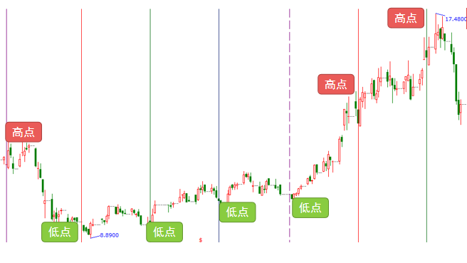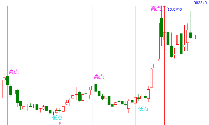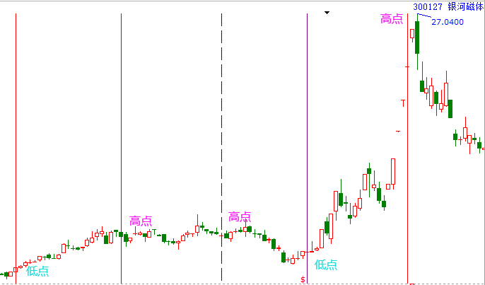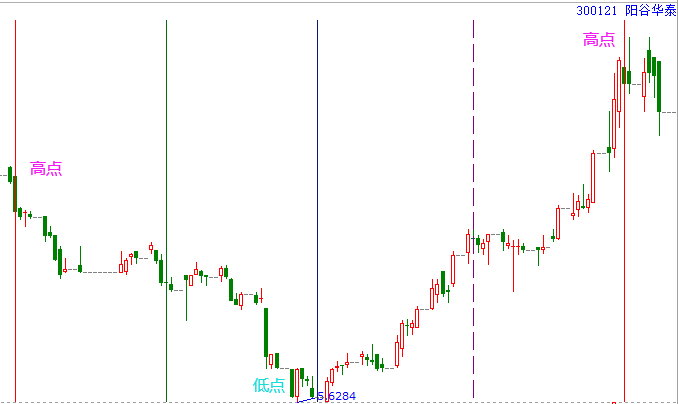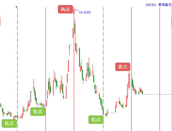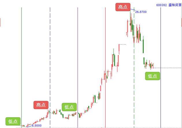 實戰應用:下圖是盛和資源600392老子時間周期數列圖,綠線時間窗口后股價創出6.5元低點即刻上攻,上漲至藍虛線時間窗形成高點,紫線修整結束,股價重回升勢漲幅達2.3倍,遇綠虛線形成高點,每次時間窗口均是股價低高點。
