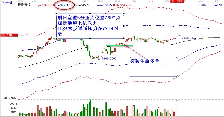 5 分鐘時間周期看pta:也是在突破極反通道生命線后的回踩然后開始的上攻,按照極反通道買賣規則,生命線不破看高一線,目標就是5分的極反通道上軌。