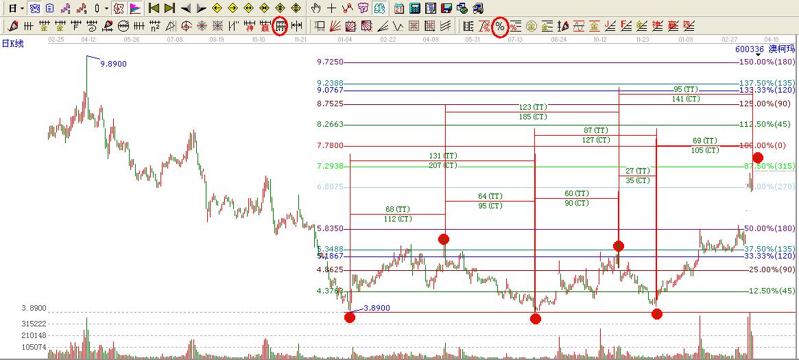 600336 澳柯瑪在2010-11-29日高點9.90位置跌至2012-01-06日3.89見底展開了一波為期68交易日的震蕩上行,在2012-04-27日高點5.55位置展開了一個為期64天的下跌【跟第一波上漲67天誤差了3天】再其2012-07-31日最低點也是3.89最低點跟上一次的低點一分不差,時間跟價格的完美演繹,就構成了雙底絕佳的介入位置。這里啟動見高點運行了60交易日也就是2012-10-29日最高5.47這一波的高點距離2012-04-27日高點5.55高點僅僅誤差了0.08當其經行第3次回調的時候調整的時間僅僅用了27個交易日【不到其上漲的180度時間】最為中國藥的是這一波的調整深度最低下探至2012-12-04日低點4.03較為明顯的比前2次底部抬高,這里就構成的3重底的一個絕佳的買點。而這個3.89的3重底的買點突破價格的180度就開始了快速拉升,目前處于270度位置6.8075上方。上方短期壓力是315度位置7.29的壓力,最為重要的就是其0度位置7.78的位置。這里是一個價格循環的開始也是一個循環的結束.時間結構通過研究歷史上重要的低點高點位置可以知道重要的時間周期是1-2個低點的時間周期間隔了131交易日,而2-3這個時間低點是其87交易日而AB高高點運行了123個交易日。目前B點高點到至今是其95個交易日完全跨越了87時間周期,那么重要的高點區域就在其123時間周期或者是100周期都是需要注意的時間拐點...