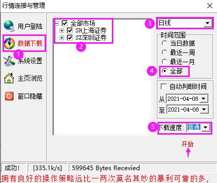 雙擊軟件右下角的燈塔圖標,打開【行情連接與管理】,點擊左側的【數據下載】,在【上海證券】和【深證證券】前面的方框打鉤選中,右上角的下載內容選擇【日線】,時間范圍選擇【全部】,下載速度選擇【普通】,然后點擊【開始】,直至下載完畢。