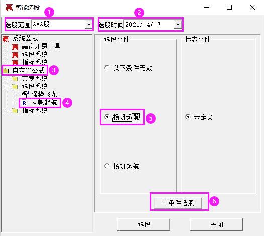 首先,選股范圍點擊旁邊的小三角,選擇AAA股,代表對滬市、深市、創業板所有上市公司進行篩選。其次,選股時間默認為當日。接著,依次點擊【自定義公式】——【選股系統】——【楊帆起航】——【單條件選股】。