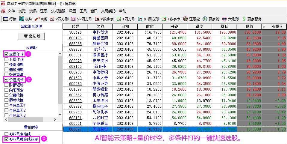 贏家江恩云策略智能選股功能,主要分為AI智能選股與技術選股兩大類型,以日線數據為選股基礎,多條件打鉤匹配,一鍵快速篩選優質個股。AI選股模型為贏家財富網數據倉庫+時間周期密碼+數學量化模型+行業深度研究+資金動向的智能選股平臺,底層邏輯均是依托時間周期密碼運行,目前贏家共推出十余種智能選股模型,詳見【贏家老子時間周期證券分析系統】介紹。技術選股主要將贏家多年實戰總結的選股模型編寫成選股指標,幫助投資者來篩選出符合條件的個股。軟件主要精選了4個選股器,分別為揚帆起航、強勢飛龍、股海擒龍和靈蛇之珠。先來了解下這4個選股器的設計原理及選出來的個股風格,方便用戶根據自己的操作需求選擇相應的選股器。